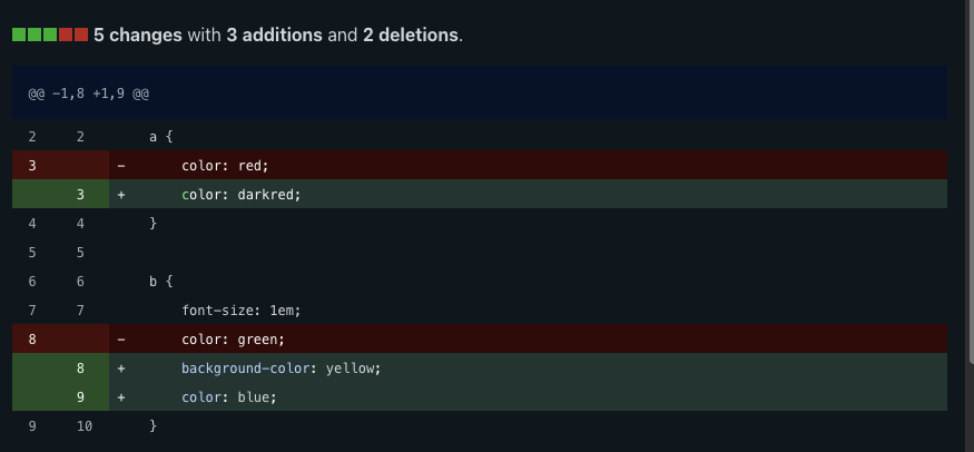 <pre>blocks I fgured it was time for smaller chunks of code to look nice too.Calculating the diffstat on the CSS Diff page is now a lot more accurate on large diffs as well as being a bunch faster. I’m really into using typed arrays in JavaScript lately, so the diffstat is now a