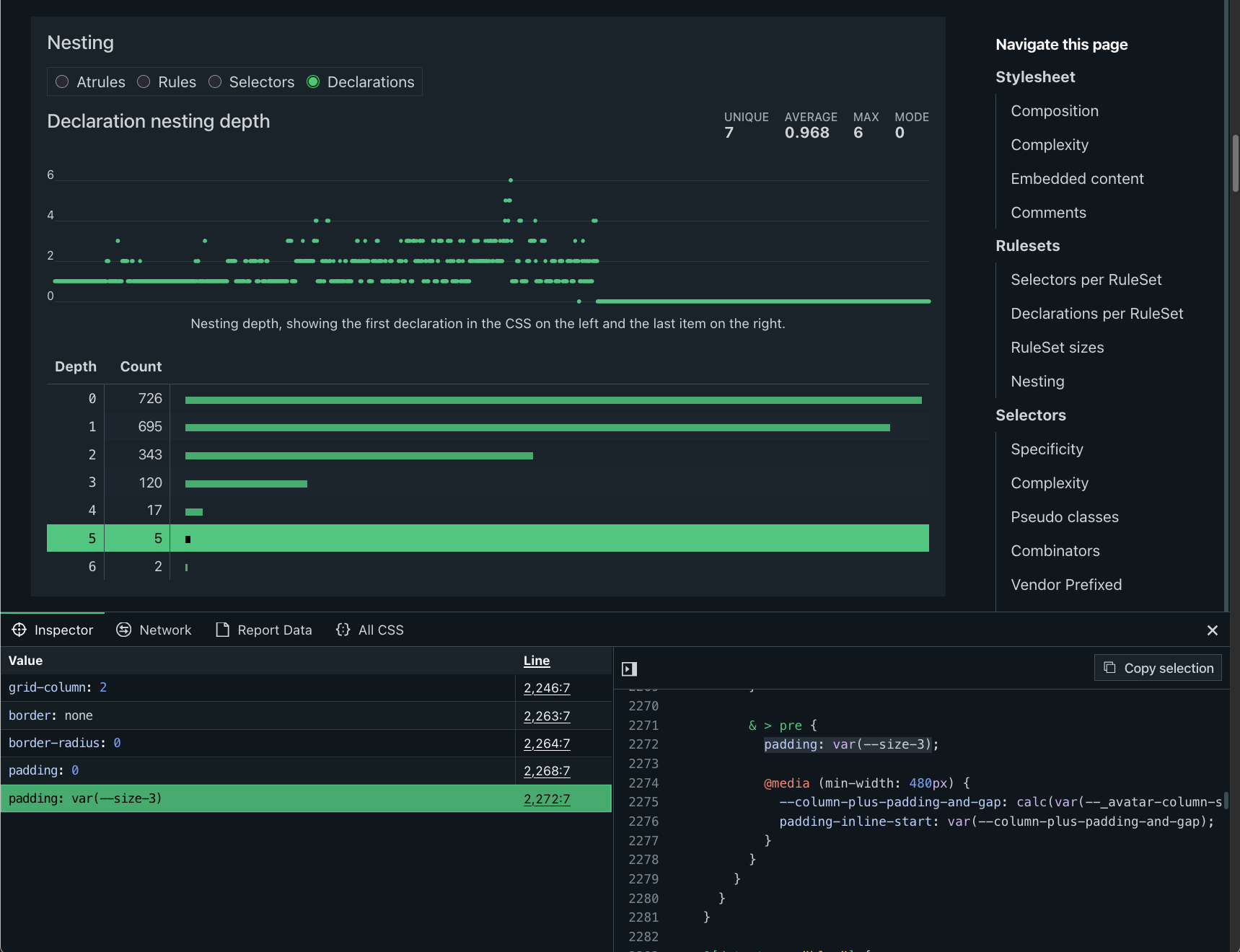 Initially sparked by the Web Almanac CSS chapter, this has been on my wish list for years and I finally got to it. It wasn’t even that hard to be honest so I’m a little disappointed in myself for not implementing this sooner. @projectwallace/css-analyzer@7.4.0 has all the details and the website now shows how deep you’re willing to go with your CSS.